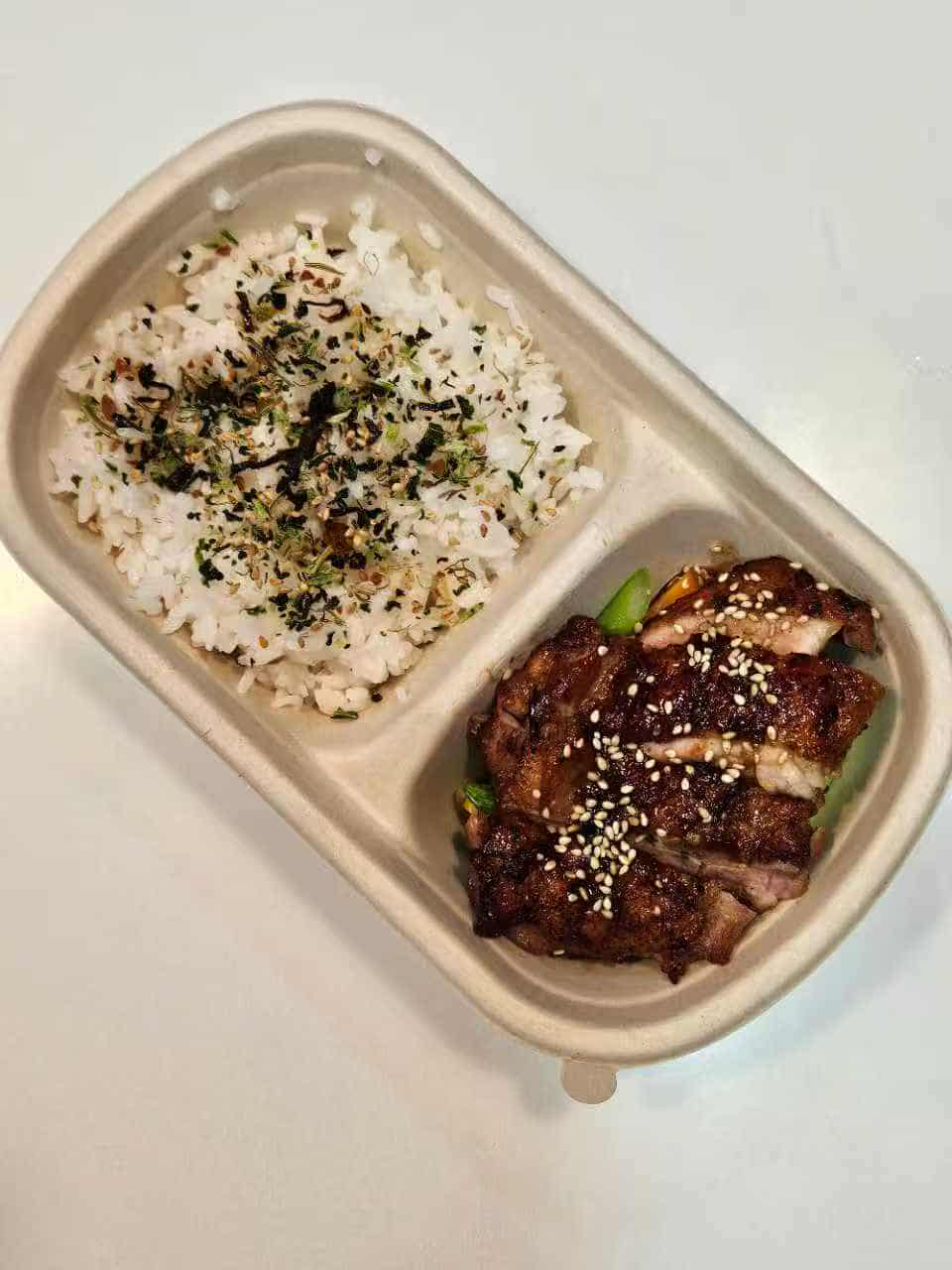 Grilled chicken thigh glazed with teriyaki over Japanese rice and mixed vegetables